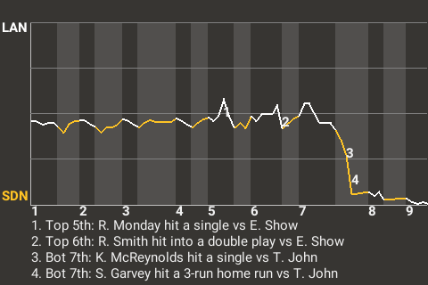San Diego 1984 took the lead, 3-0, on Steve Garvey's 2nd home run of the season. The 3-run home run came off Los Angeles 1978 pitcher Tommy John in the bottom of the seventh.