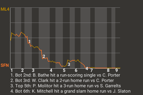 Kevin Mitchell, who is tied for 7th in the NL in total bases with 90, came through for San Francisco 1989 with a grand slam home run in the bottom of the sixth. The third baseman went 3 for 5 for the game, including 1 home run and 2 doubles. He scored 2 runs and collected 6 RBI.